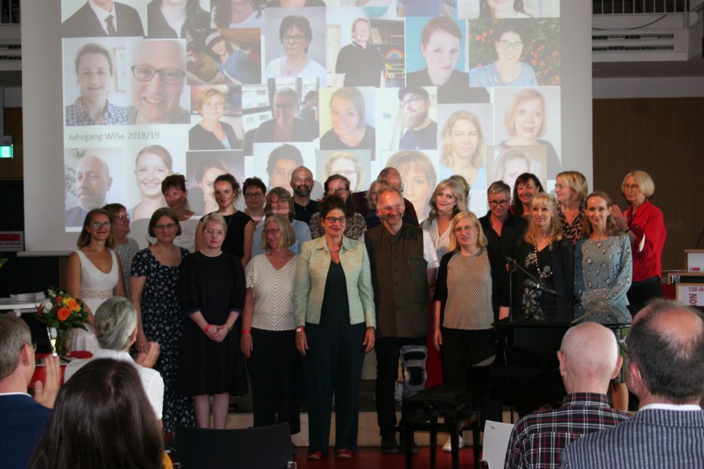 Es begann im Jahr 2013 mit einem Forschungsprojekt-Antrag durch drei Professorinnen der ASH (Theda Borde, Elke Kraus und Jutta Räbiger). Die Rektorin, Prof. Bettina Völter, und der Dekan des neuen Fachbereiches II, Prof. Uwe Bettig, bedankten sich bei den weitsichtigen Initiatorinnen und allen Umsetzer*innen in Folge. Die ASH richtet sich hier konsequent mit diesem innovativen Angebot – ein digitaler Studiengang – an Fachleute im Gesundheitswesen, die die Praxis verändern wollen. Besondere Würdigung erhielt die Studiengangsleitung, Prof. Eva-Maria Beck für die erfolgreiche Umsetzung und Etablierung des Studiengangs innerhalb der Hochschule steht. „Die is die Seele det Janzen“ so der Originalton einer Absolventin. Gastrednerinnen waren Dr. Ronja Behrend – eine Absolventin der ASH, die nun in der Charité interprofessionelle Lehre koordiniert. Sie sprach zu „Interprofessioneller Ausbildung und Versorgung in Deutschland. Wo stehen wir und wie kann es gelingen?“. Ihr Fazit: es gibt große Aufgaben aber auch Anfänge von Veränderung im Bildungssystem. Die Herausforderungen bleiben jedoch aufgrund der i.d.R. monodisziplinären „Bildungssilos“ der Berufe. Eine externe Perspektive nahm Dr. Martina Kloepfer, die aktuelle Präsidentin des Instituts für Gender-Gesundheit, ein: „Zusammenarbeit auf Augenhöhe – möglich oder Illusion“? Ihre Tipps vor allem für die Absolvent*innen kamen gut an. Sie ermutigte diese, selbstbewusst mitzugestalten und initiativ zu sein, sich zu vernetzen und Allianzen für gute Ideen zu bilden. Es braucht Zeit für Veränderungen – „Sie bohren dicke Bretter – seien Sie präsent und mischen Sie sich ein. Vermehrte Zusammenarbeit wird dringend gebraucht.“