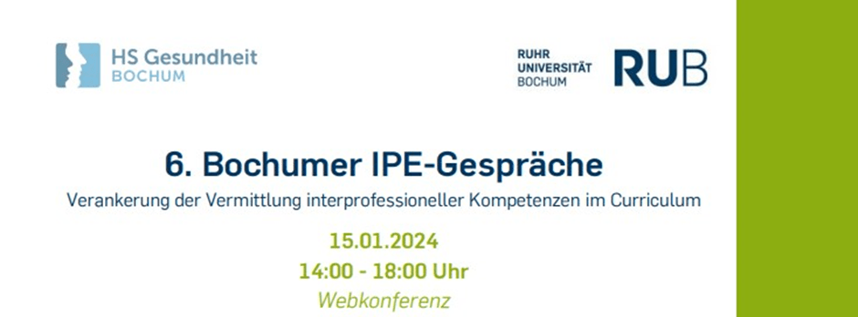 Am 15.01.2024 finden zum 6. Mal die Bochumer IPE-Gespräche – die Tagung zur interprofessionellen Bildung im Gesundheitswesen als Webkonferenz von 14.00 – 18.00 Uhr statt. Die Bochumer IPE-Gespräche (InterProfessionalEducation) bieten ein Forum für interprofessionell Lehrende und Interessierte im Bereich der Medizin und der Gesundheitsfachberufe.
