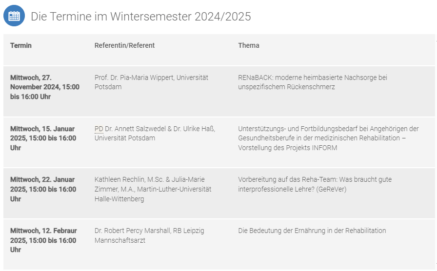 15.01.2025: Unterstützungs- und Fortbildungsbedarf in der medizinischen Rehabilitation mit PD Dr. Annett Salzwedel & Dr. Ulrike Haß (Universität Potsdam)