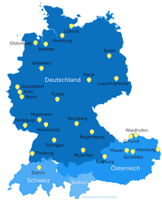 Karte mit Mouseover Links – Interprofessionelle Ausbildungsstationen D-A-CH Raum